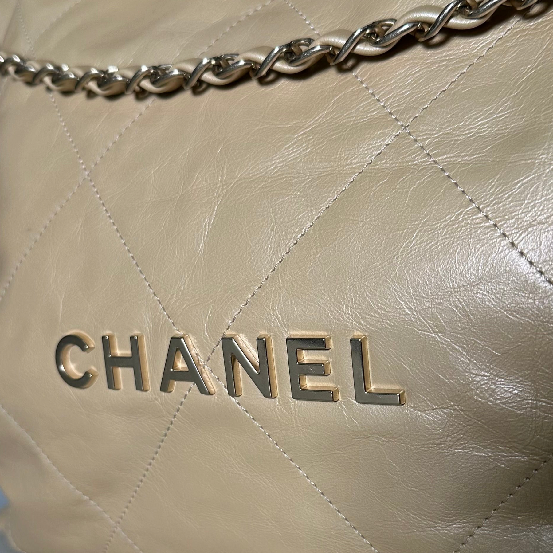 Die Chanel Tasche 22 ist aus hochwertigem Leder gefertigt und hat eine einzigartige beige Farbe. Die Metallic Hardware in Eisgold verleiht der Tasche einen eleganten Touch. Die praktische Pochette bietet zusätzlichen Stauraum. Perfekt für einen stilvollen Look und um Ihre wichtigsten Besitztümer sicher aufzubewahren.