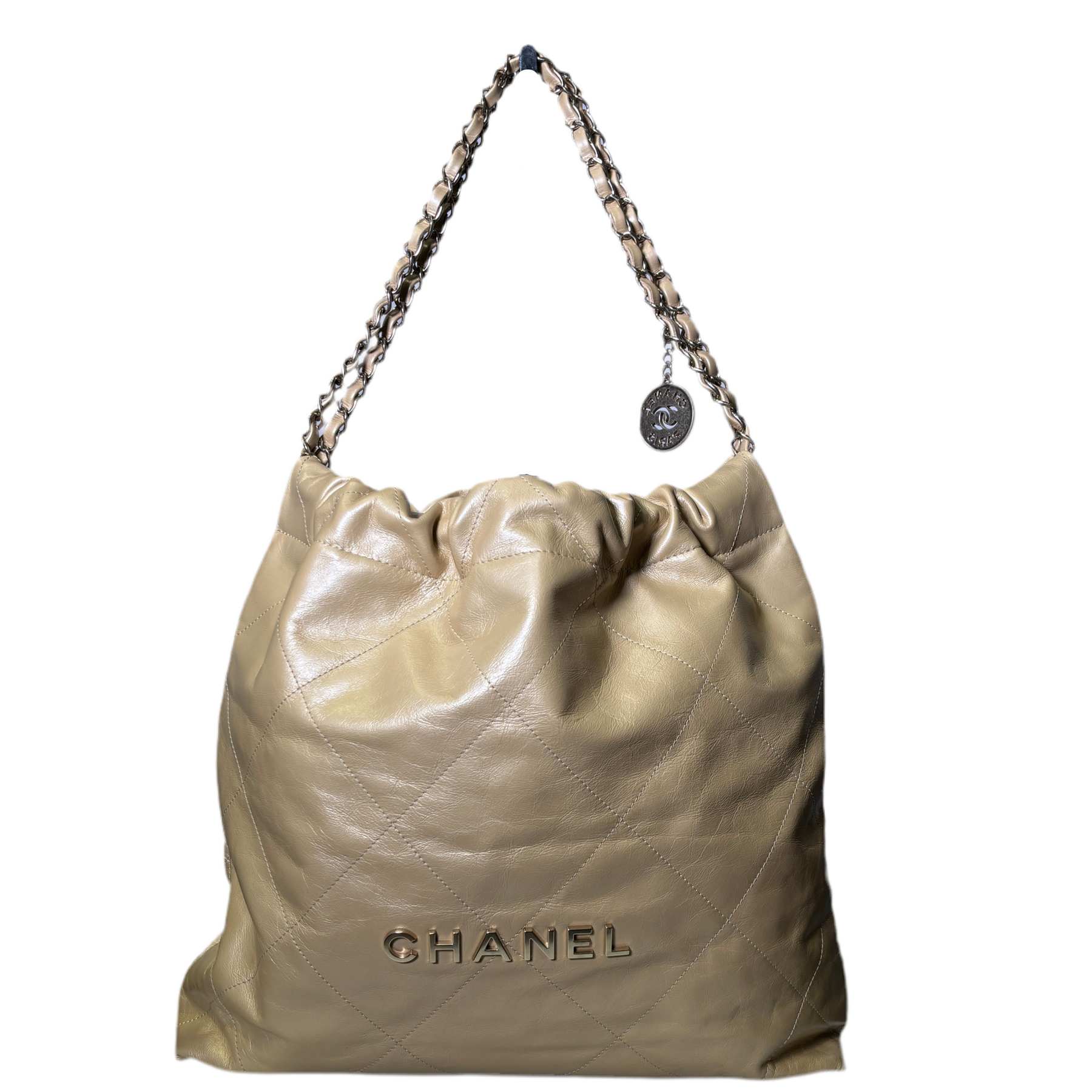 Chanel Tasche 22 Leder Beige Metallic Hardware Eisgold mit Pochette