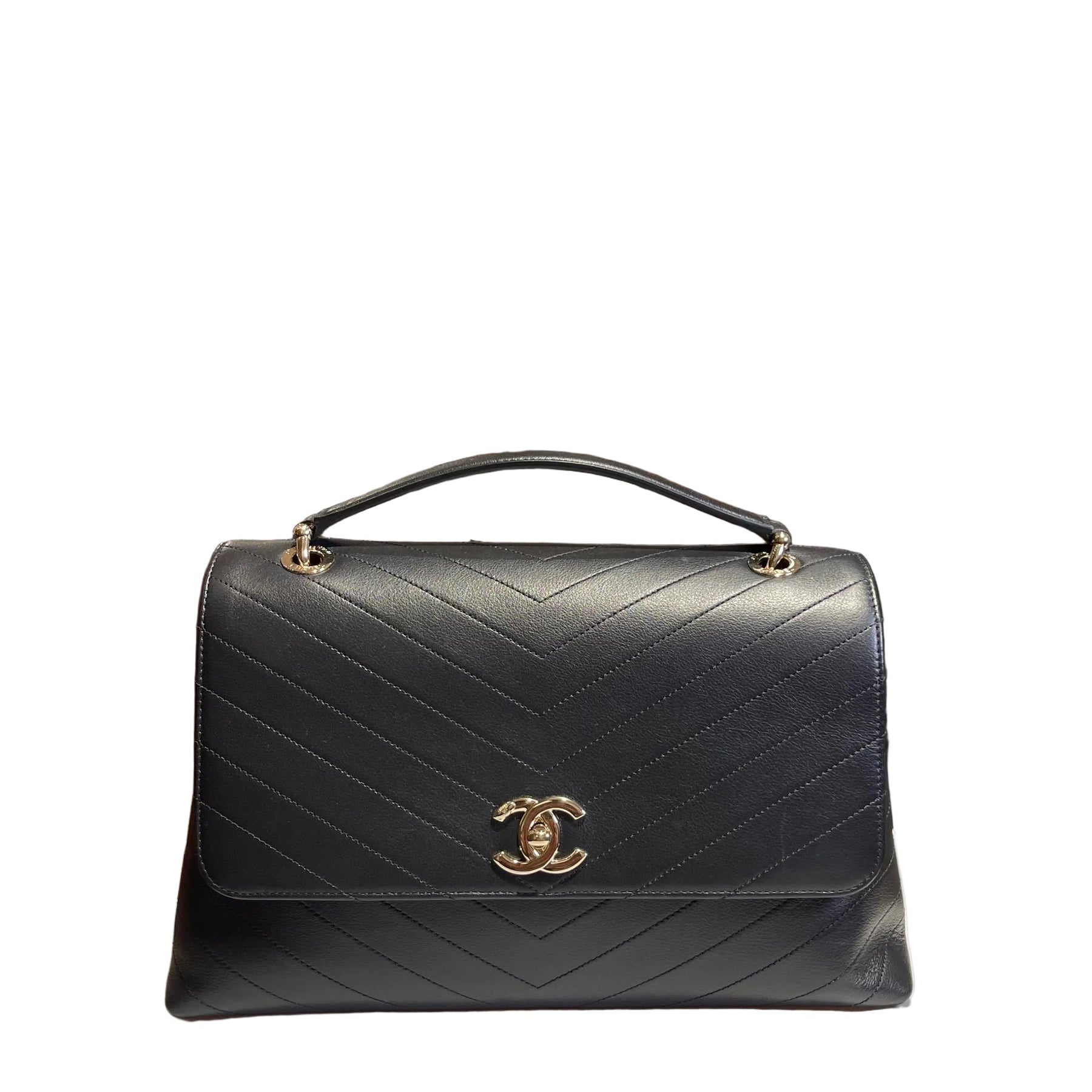 Mit der Chanel Tasche Top Handle 2 Way kannst du stilvoll unterwegs sein. Das Chevron-Muster in Schwarz und Eisgold verleiht der Tasche einen eleganten Look. Die 2-Wege-Trageoption ermöglicht es dir, sie als Handtasche oder Schultertasche zu tragen. Perfekt für jede Gelegenheit und immer ein Hingucker.
