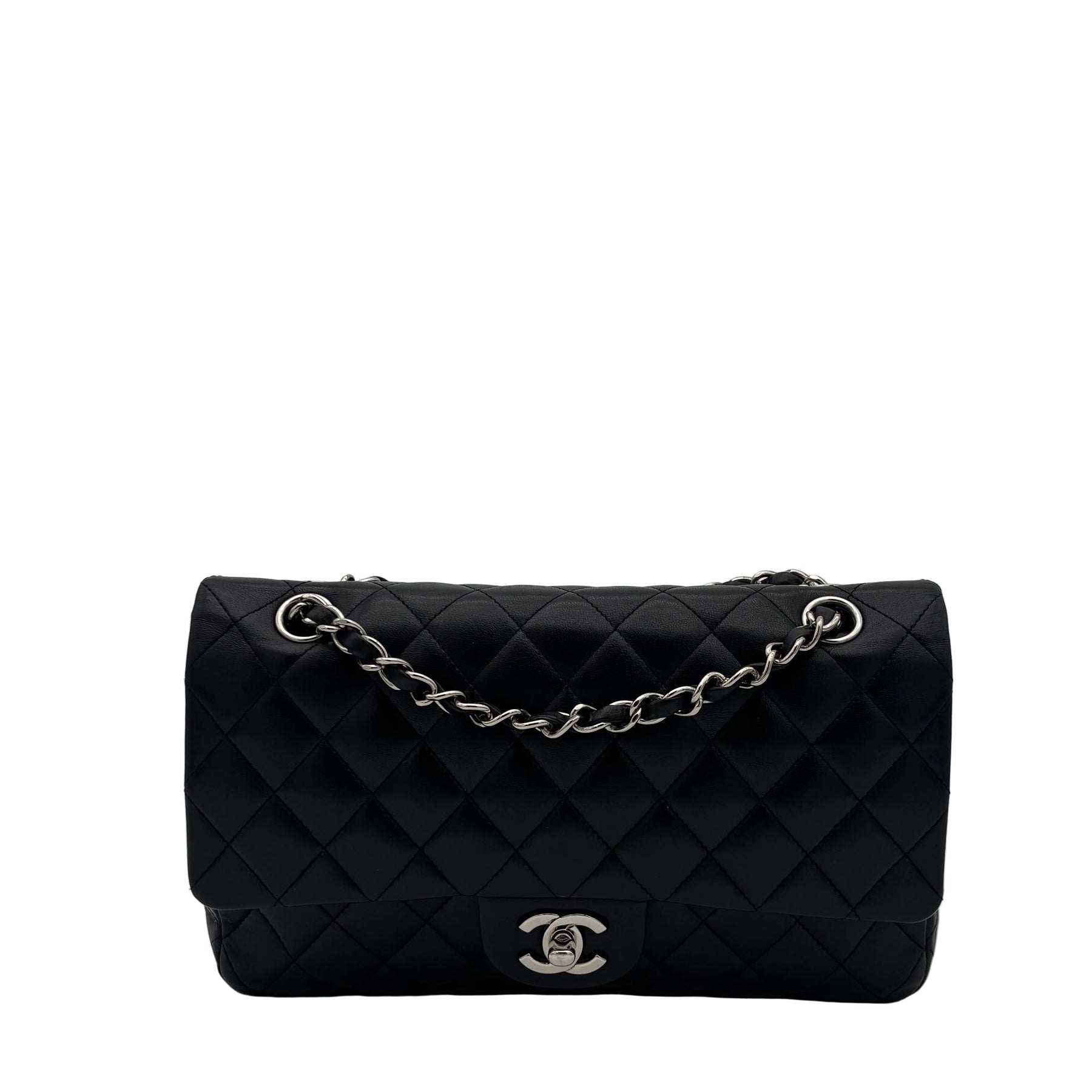 Die Chanel Timeless 11.12 Double Flap in schwarzem Nappa-Leder mit silberner Hardware ist ein exemplarisches Modell aus der Kollektion 2009-2010. Die ikonische Form bietet sowohl Stil als auch Funktionalität. Das hochwertige Leder garantiert Langlebigkeit, während die doppelte Klappe zusätzlichen Schutz für Ihre Wertsachen bietet.