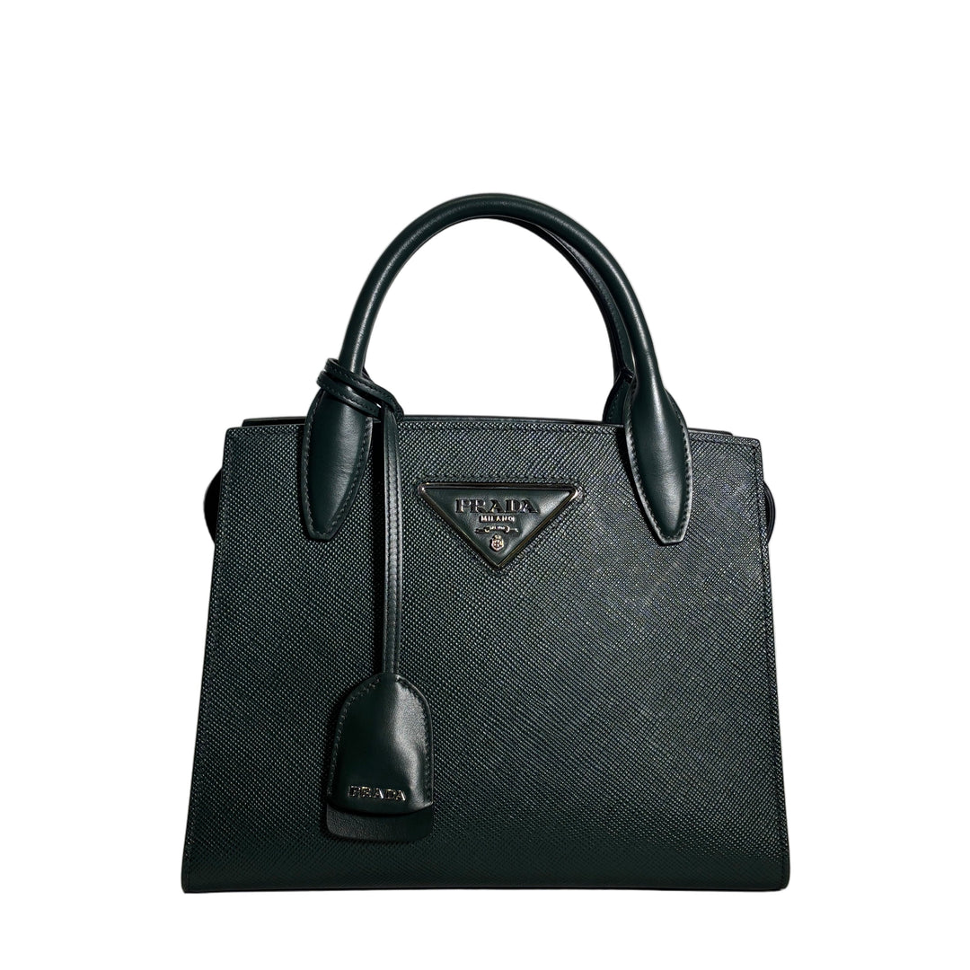 Prada Tasche 2way Saffiano Glattleder Dunkelgrün Logo Hardware Silber Schulterriemen