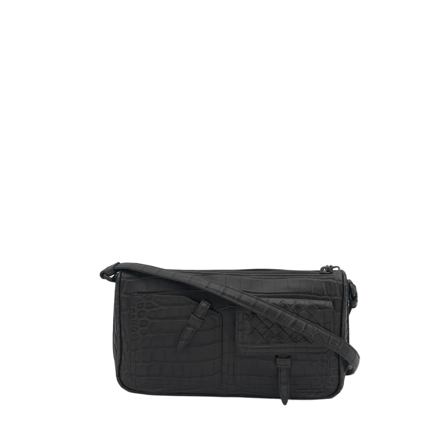 Bottega Veneta Tambura Multi Pocket Shoulder Bag aus kroko-geprägtem Leder in Etoupe. Mehrere Taschen sorgen für Struktur und Funktion, während Material und Farbton dem Design eine dezente Präsenz verleihen.