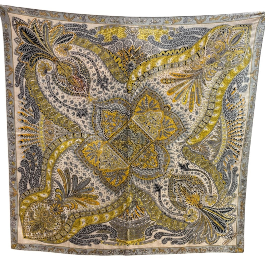 Hermes Carre Les Muserolles Apricot Grau Gelb Seide 90 x 90 cm