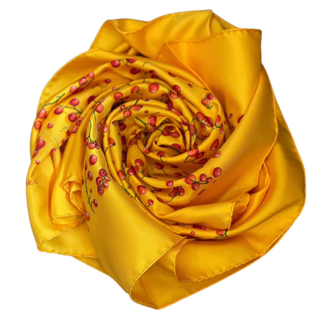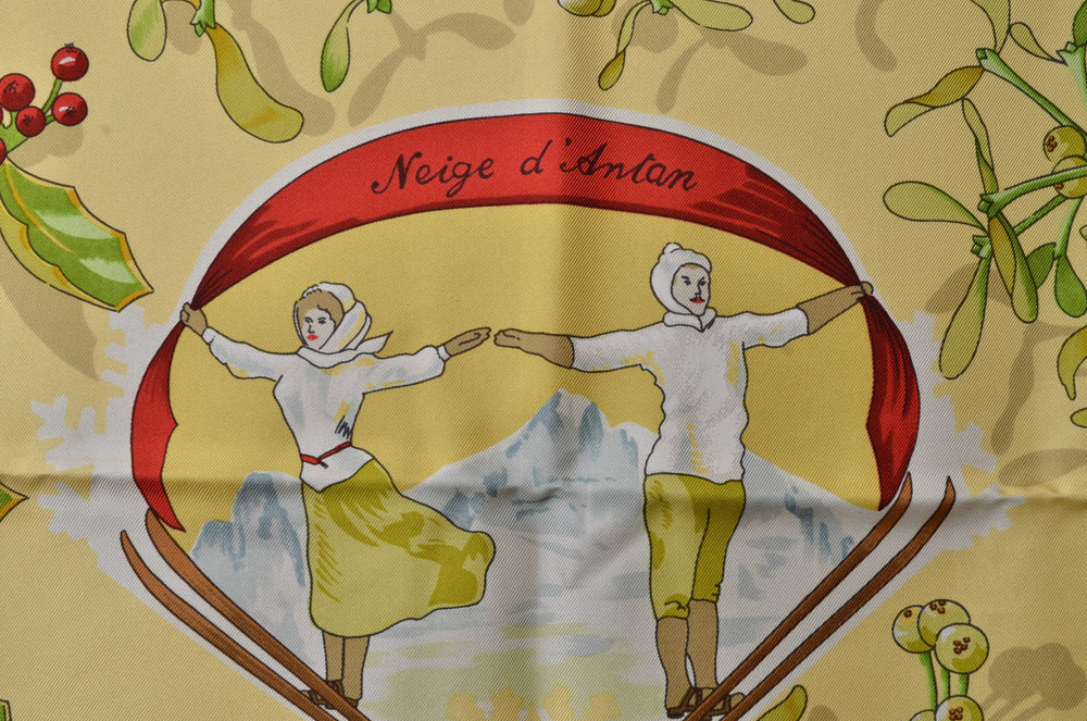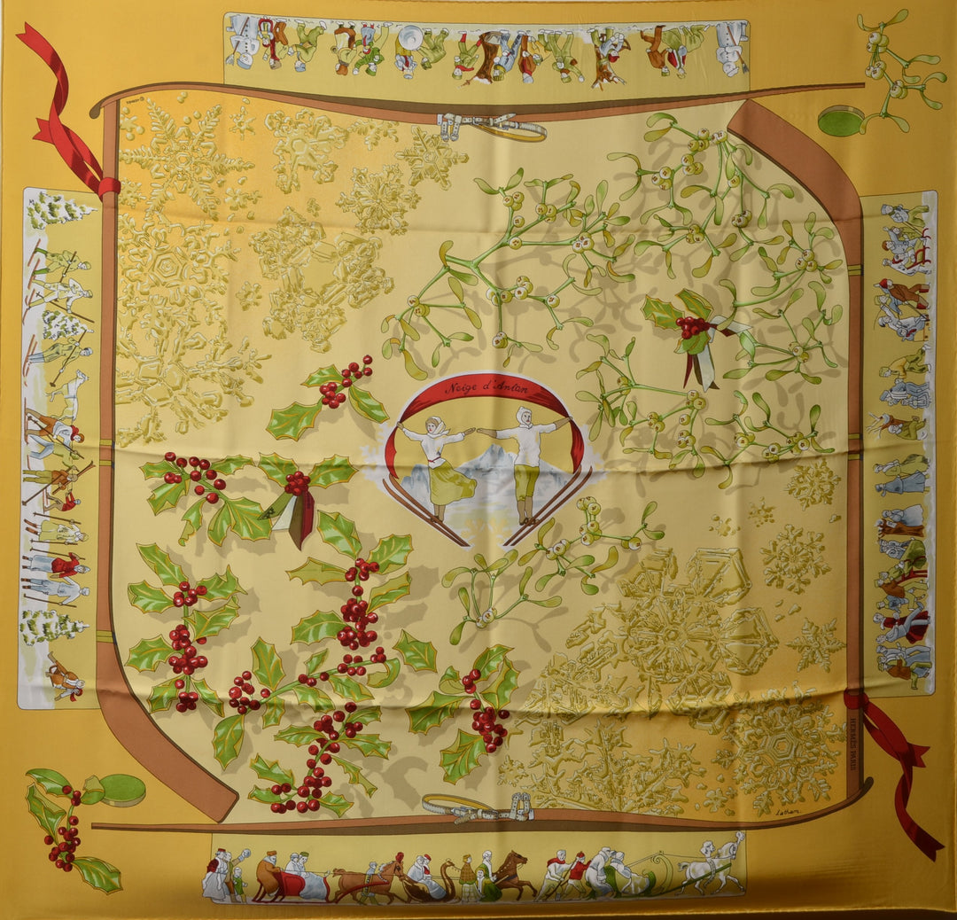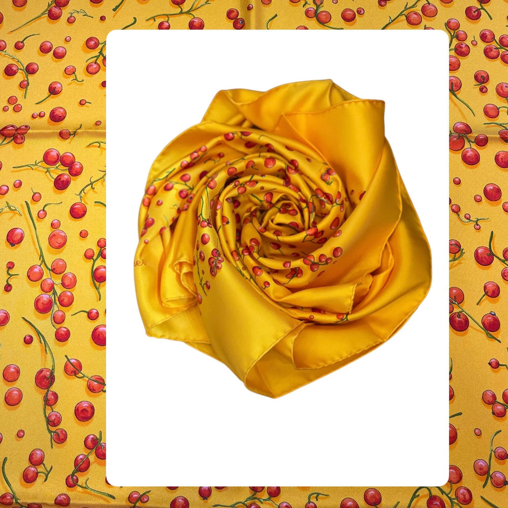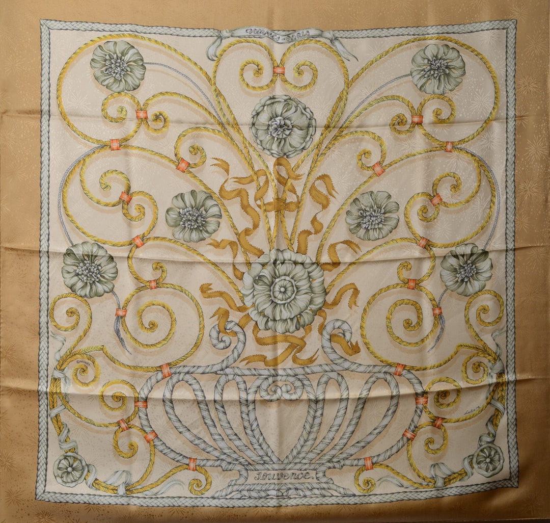 Hermes Carre Les Muserolles Apricot Grau Gelb Seide 90 x 90 cm