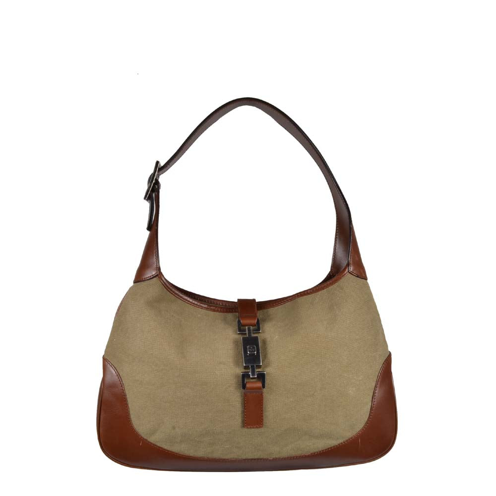 Gucci Tasche Jacky O Canvas Leder Braun Canvas Khaki Silber Hardware Eloxiert