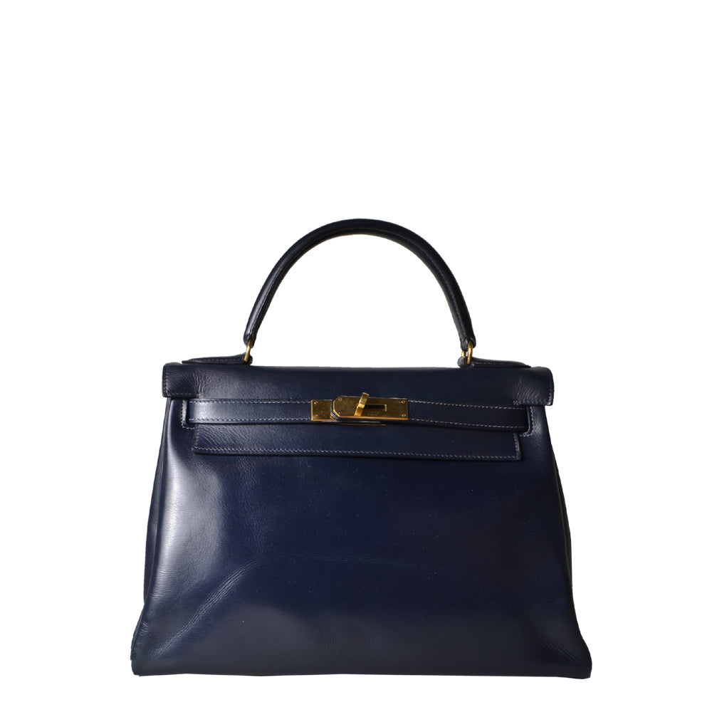 Hermes Kelly 28 Retourne Box Leather Blue Gold Hardware Tasche Vintage