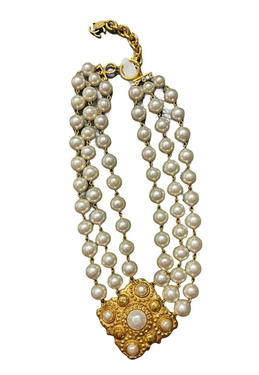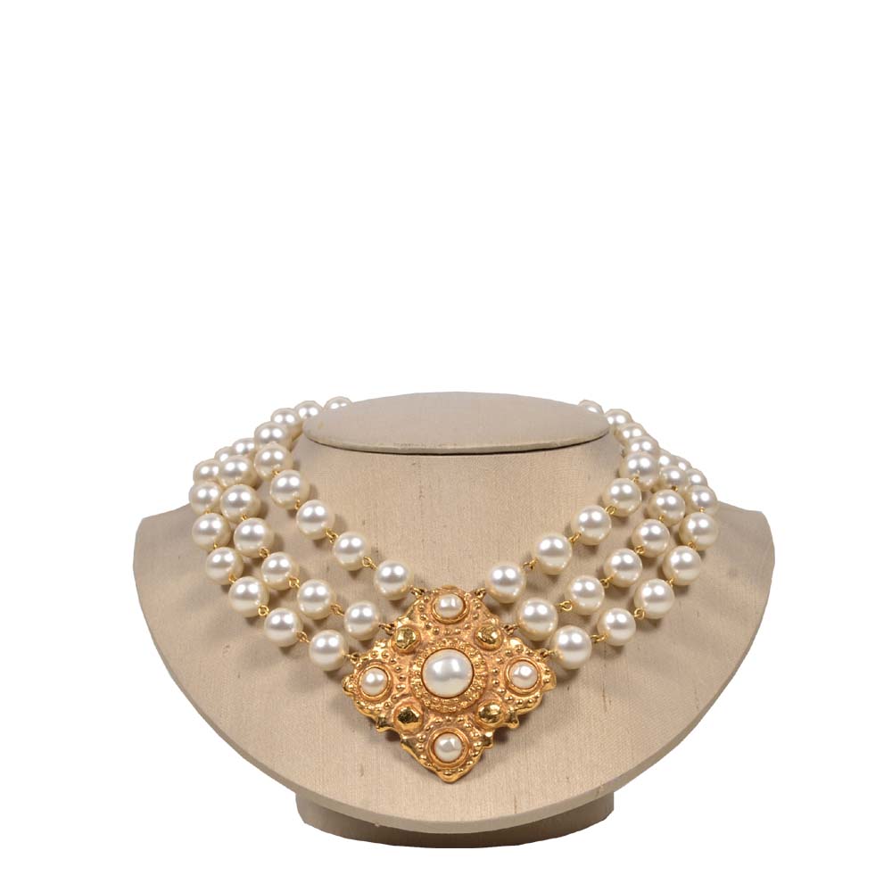 Chanel 3 String Stränge Pearl Necklace Perlen Kette Square Pearl-Goldplate