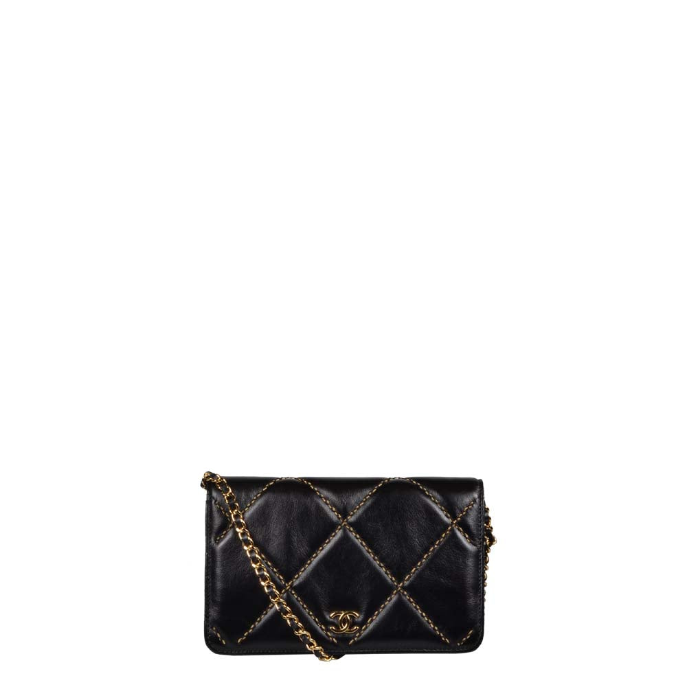 Chanel Wallet On Chain Schwarz Leder Stepp mit Gold Schwarzer Kordel Hardware Gold