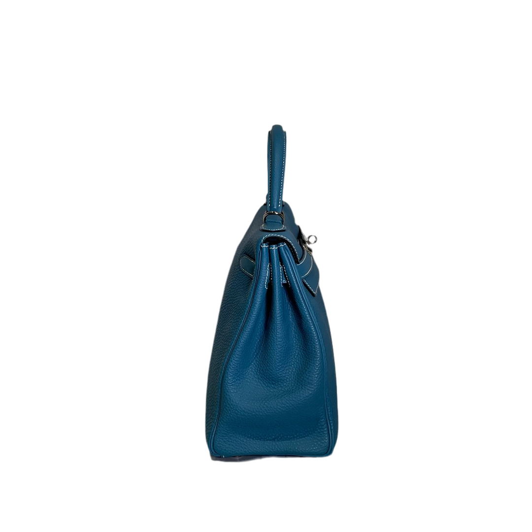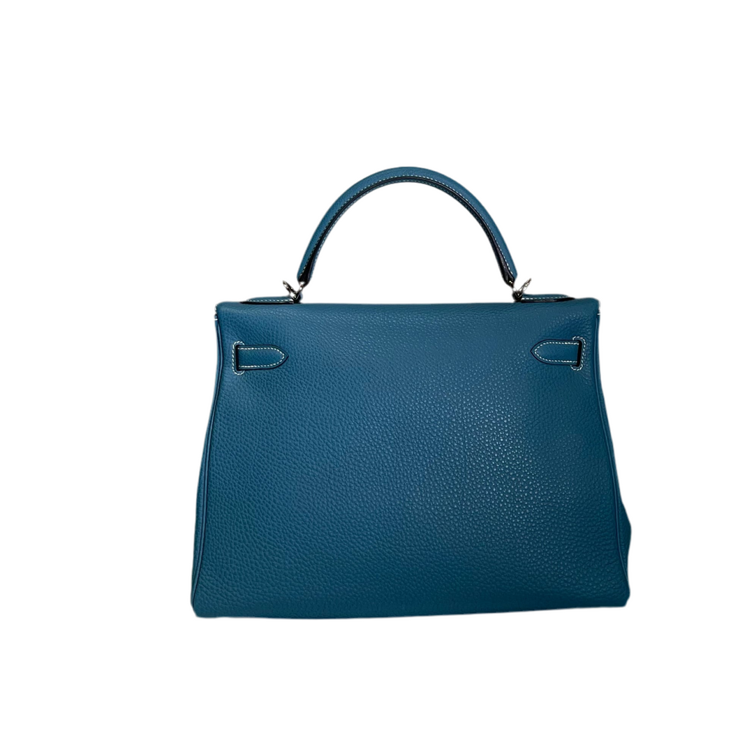 Diese wunderschöne Handtasche stammt aus dem Hause Hermes und nennt sich “Kelly”. Das Design der Tasche findet seinen Beginn in den 1930er Jahren unter dem Designer Robert Dumas. Ihren Namen erlangt die Kelly in den 50er Jahren durch Grace Kelly. Hier zum Verkauf steht die Kelly in der Größe 32, hergestellt 2002 aus hochwertigem Togo Leder in der Farbe Blue Jeans mit Palladium Hardware.