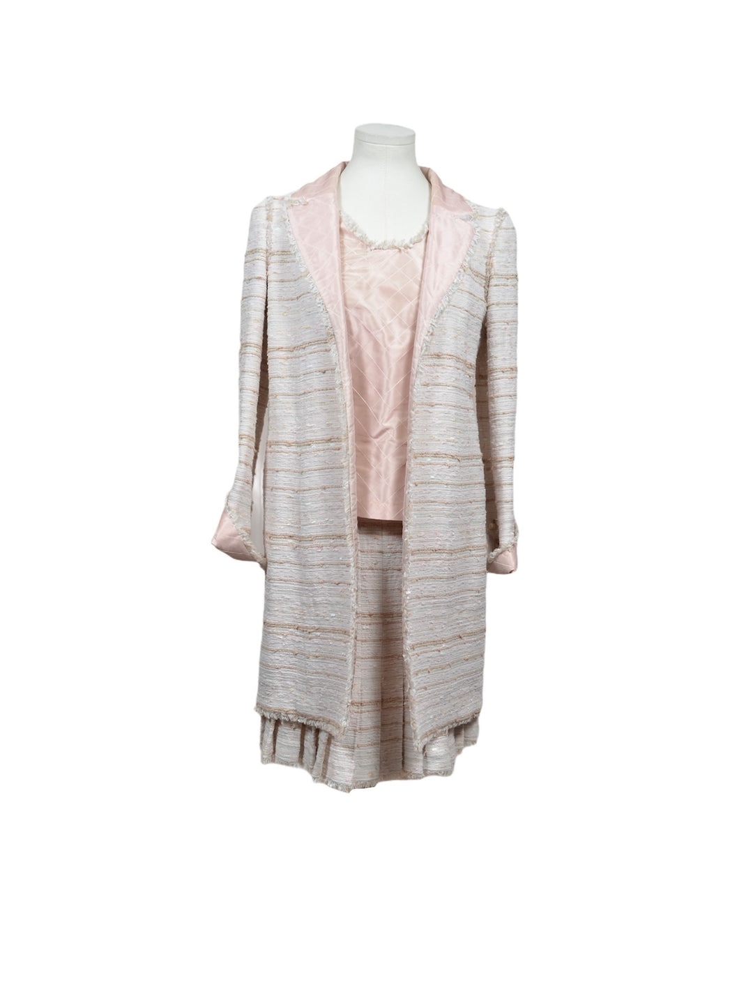 Chanel 4 Teiler Mantel Top Rock Gürtel Bouclé Seide Rose Gr. 36