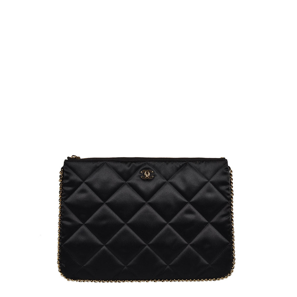 Diese tolle Pochette aus Satin stammt aus dem Modehaus Chanel. Sie hat eine integrierte Kette, welche um die Tasche herum verläuft. Durch ihre Größe ist sie die perfekte Tasche für schicke Anlässe.