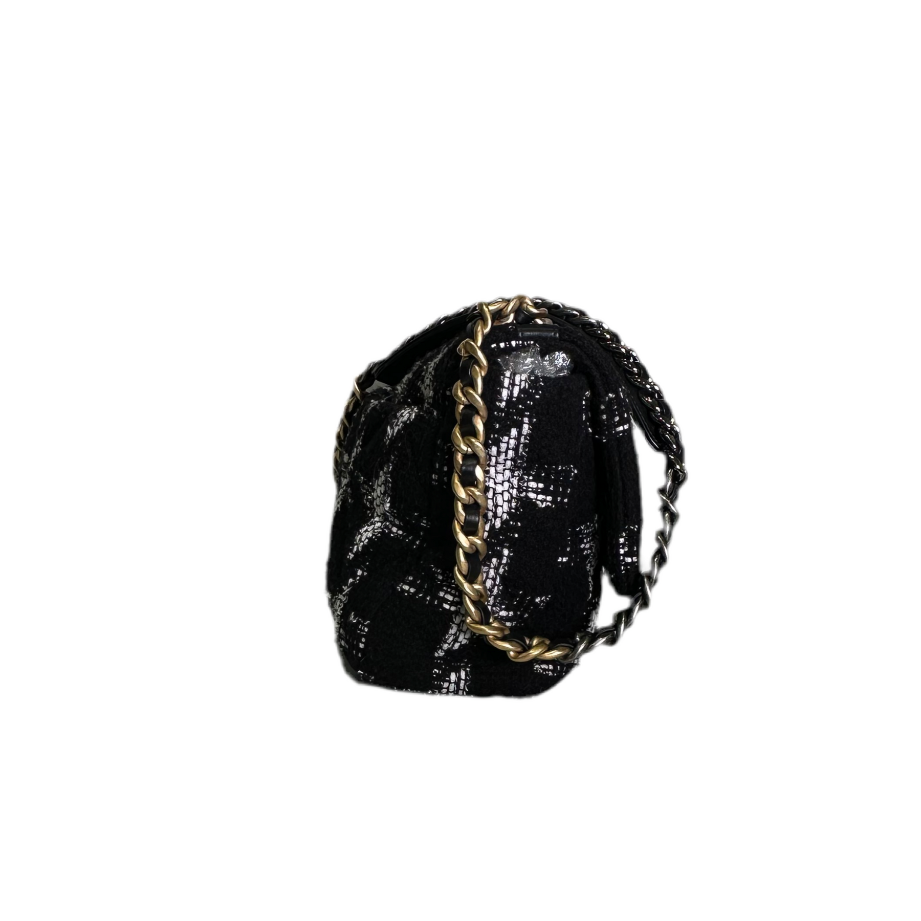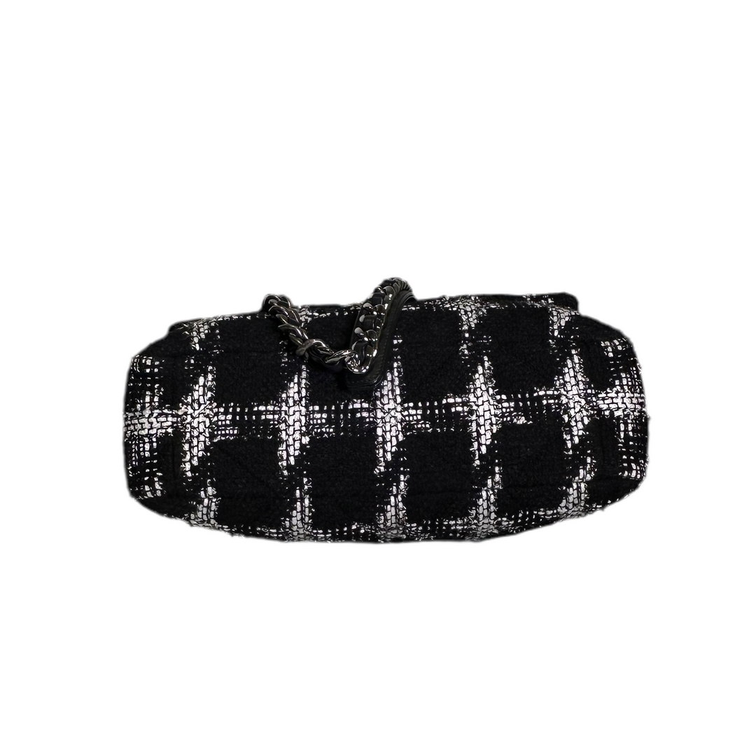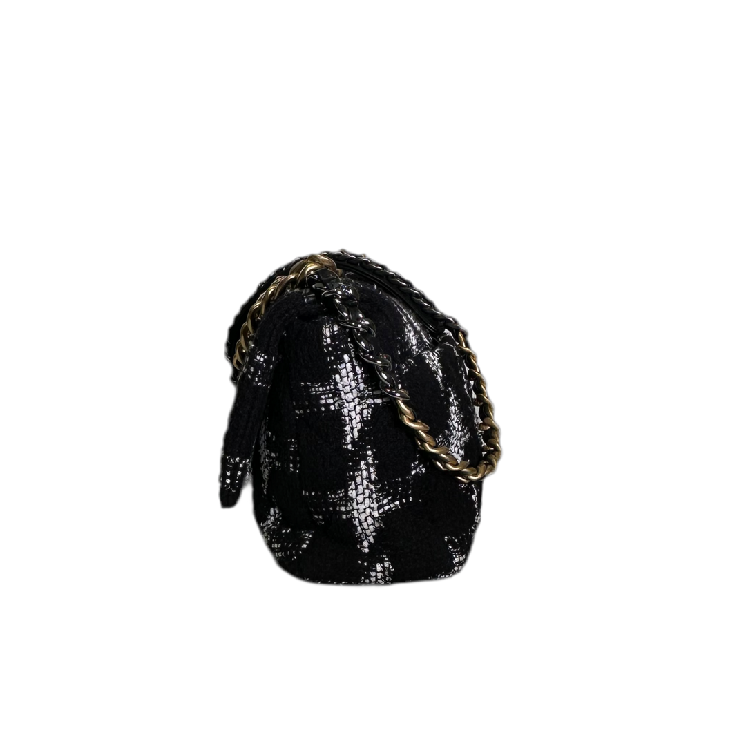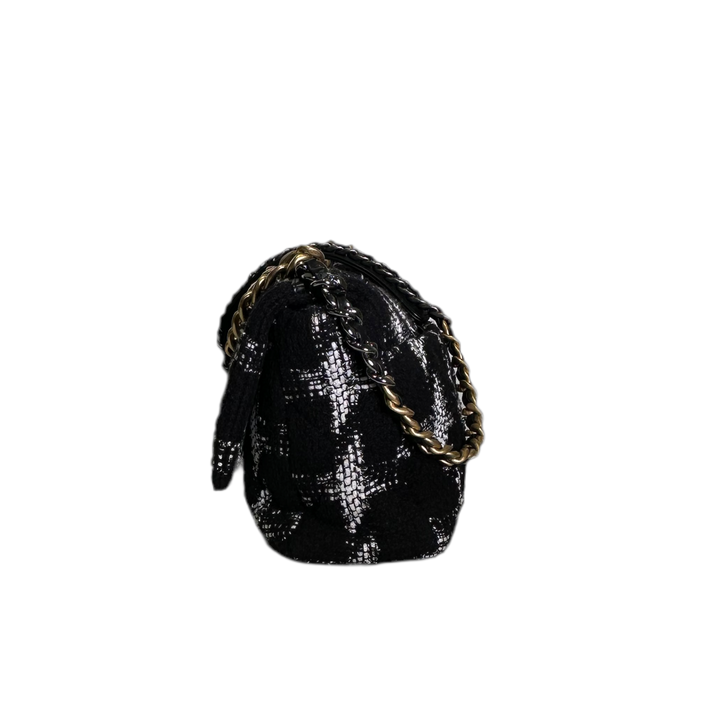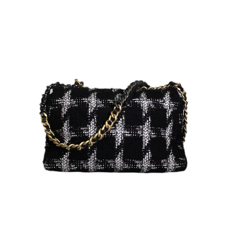 Erlebe die zeitlose Eleganz und Luxus mit der Chanel Tasche 19. Das geräumige Tweed-Design in Schwarz und Weiß wird durch die glänzende Hardware in Gold und Silber noch veredelt. Die Eloxiert-Beschichtung sorgt für Langlebigkeit und strahlenden Glanz. Perfekt für einen stilvollen und raffinierten Look!