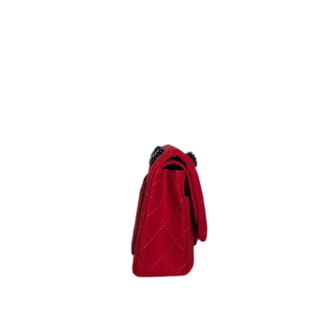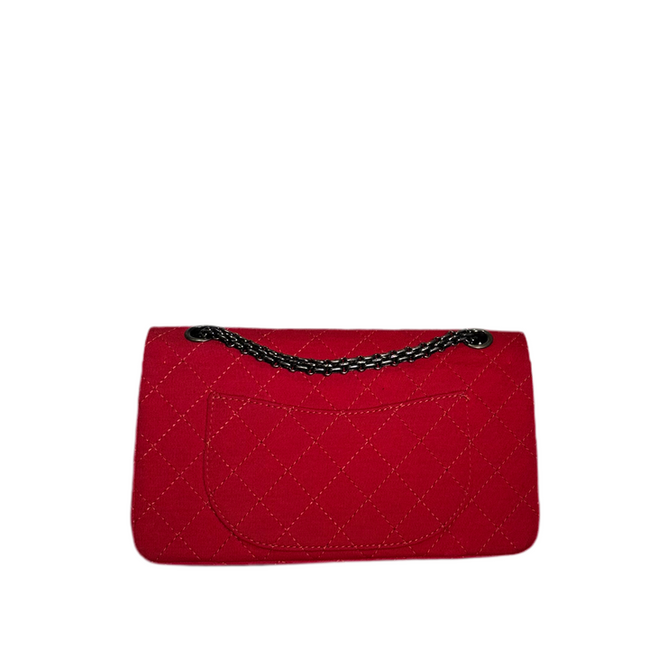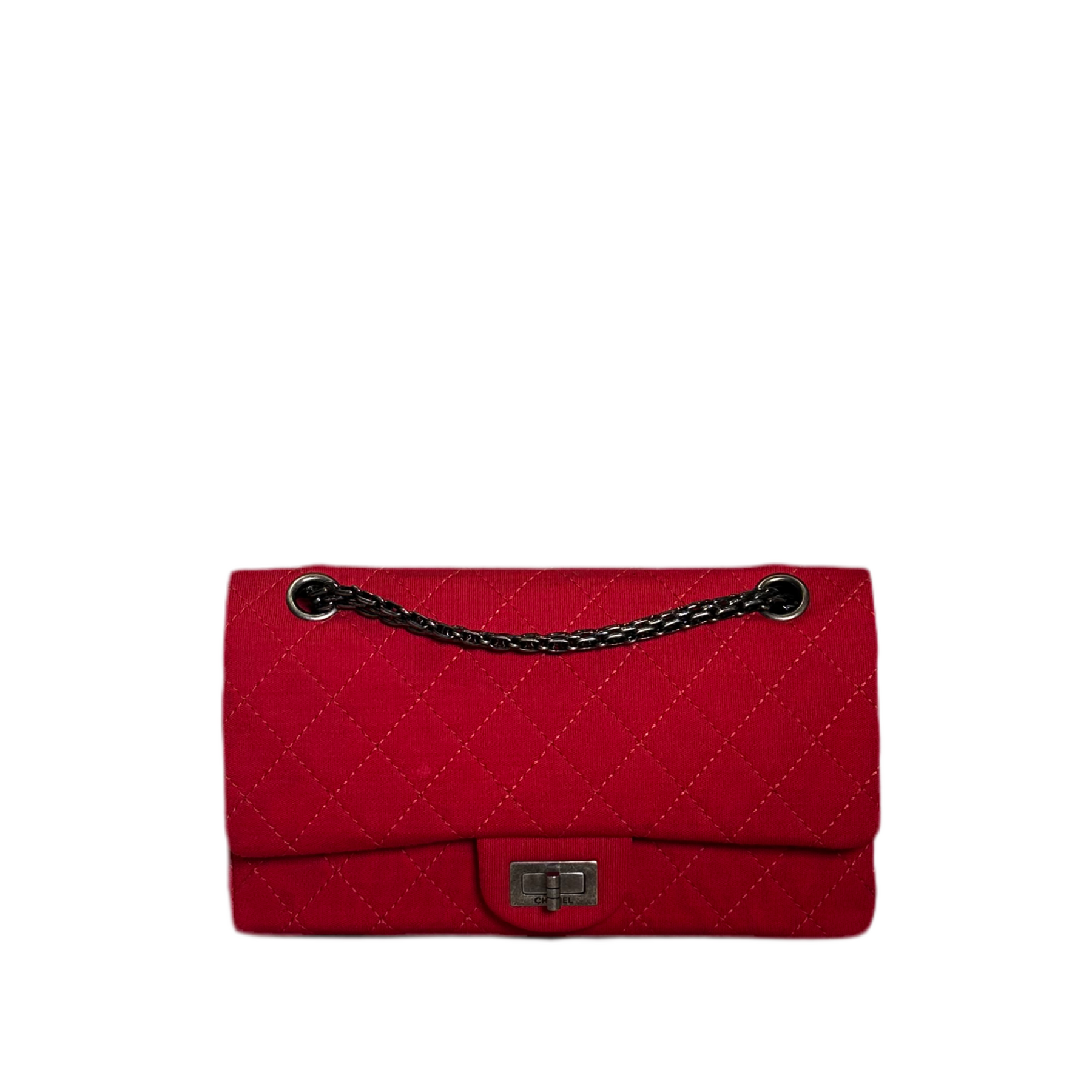 Entdecken Sie die zeitlose Eleganz der Chanel Tasche 2.55 mit rotem Jersey und eloxierter Hardware. Das hochwertige Material und die sorgfältige Verarbeitung machen sie zu einem langlebigen Begleiter. Perfekt für jede Gelegenheit, verleiht sie jedem Outfit einen Hauch von Luxus.