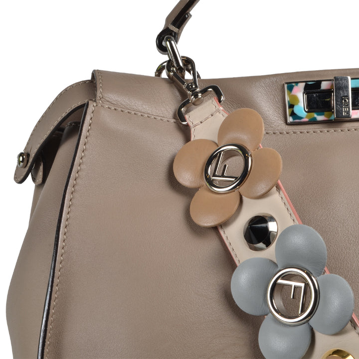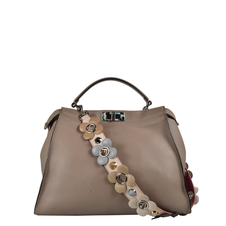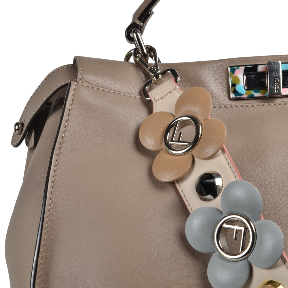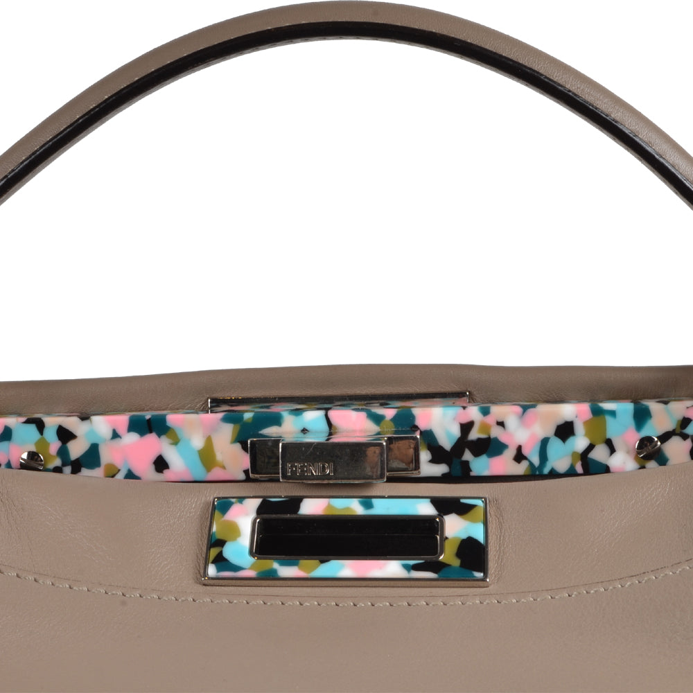Die schöne Tasche von Fendi heißt Peek A Boo. Die Peek A Boo, in der Größe Large, ist ein schöner Begleiter für den Alltag. Sie ist bei uns mit 2 Schulterriemen und etoupe-farbenen Henkel. Die Tasche fällt besonders auf durch die bunt marmorierte Verzierung am Verschluss und das wunderbare Leder. Neben dem klassischen einfarbigen Lederriemen gehört zu der Tasche ein dekorativer Riemen, welcher mit Lederblume verziert ist.