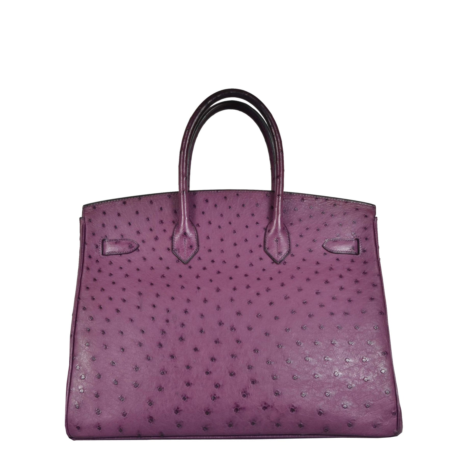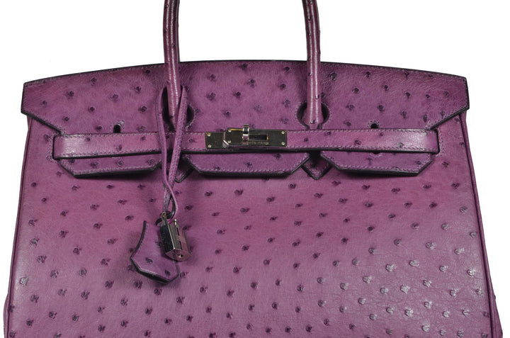 Diese tolle Tasche stammt aus dem Hause Hermès und nennt sich Birkin. Hier steht sie zum Verkauf in der Größe 35 in einem tollen Lilaton aus Straußenleder.