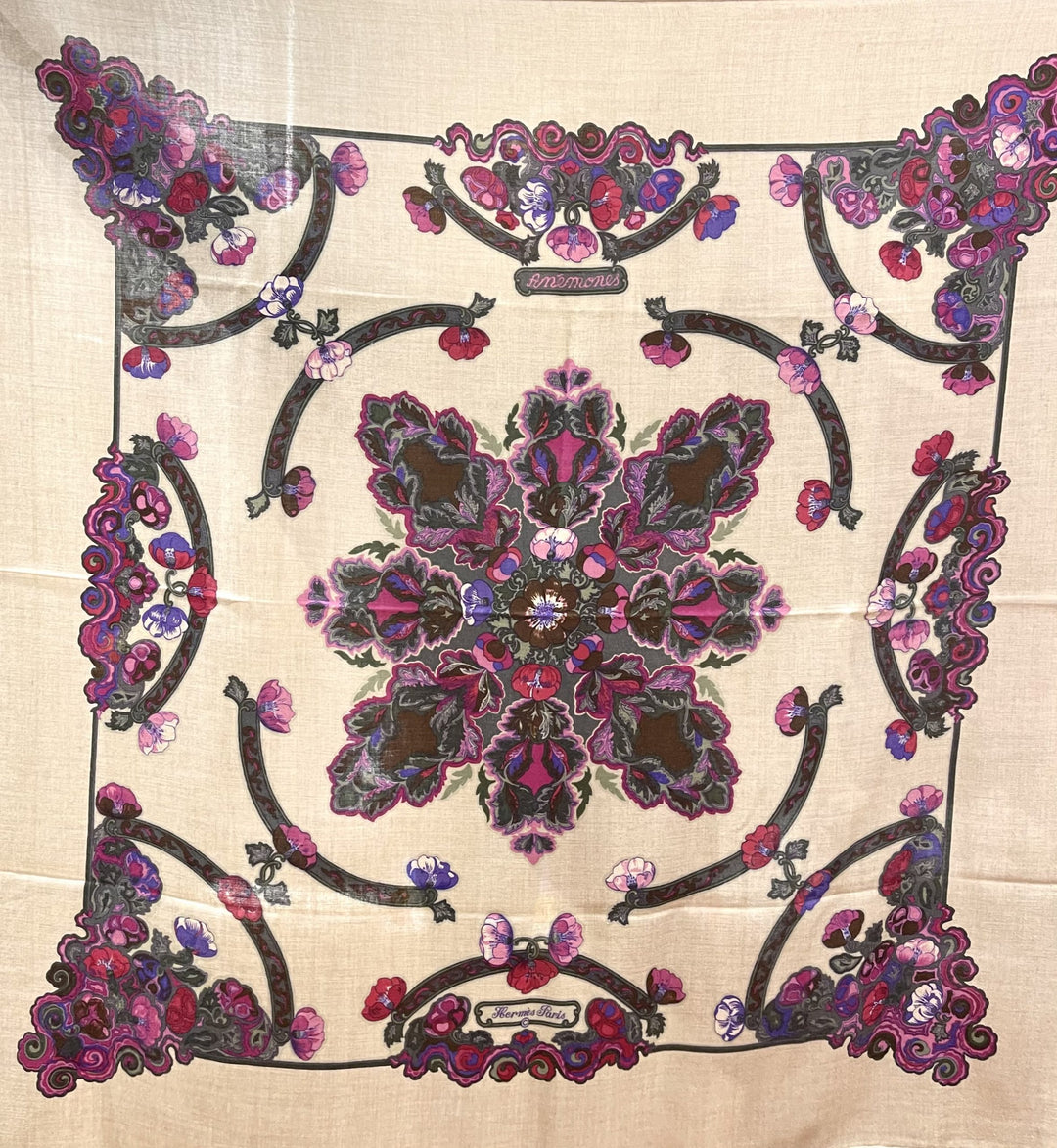 Hermes Carre Scarf Anemones Cashmere / Silk 140 x 140 cm beige pink Vintage