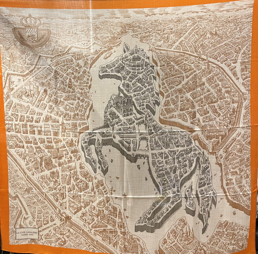 Hermes Carre Tuch La Cite Cavaliere aus Cashmere und Seide 140 x 140 cm orange beige grau