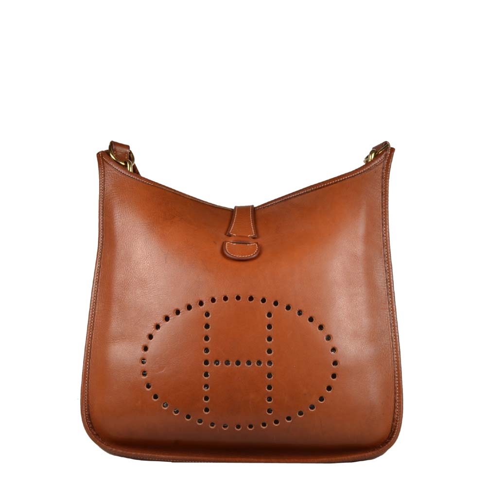 Eine schöne Hermes Evelyne ist immer eine zeitlose Tasche. Sie ist in einem warmen Cognac gehalten und somit zu jedem Outfit passend.