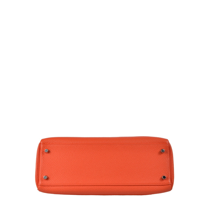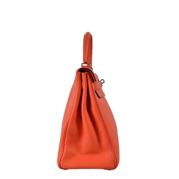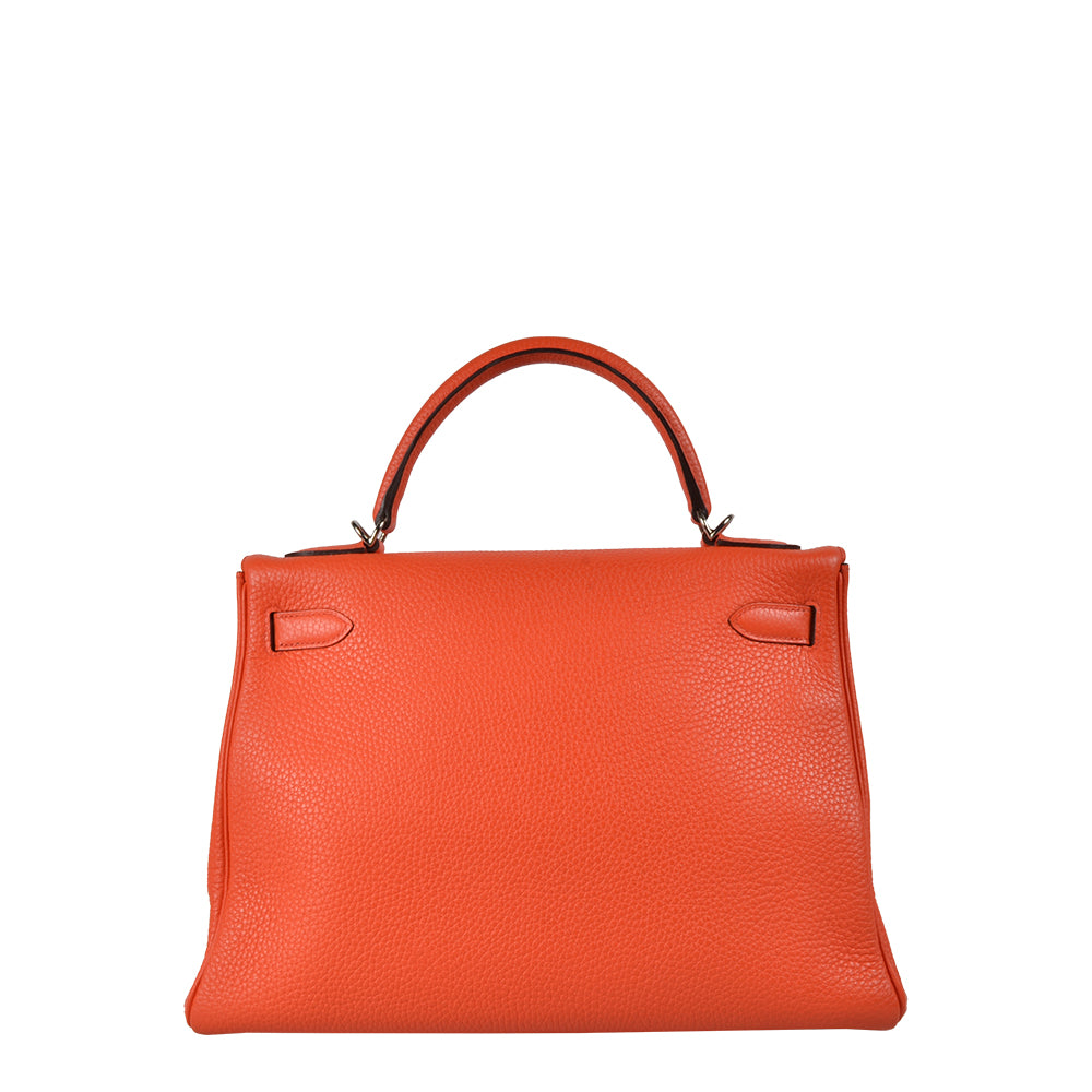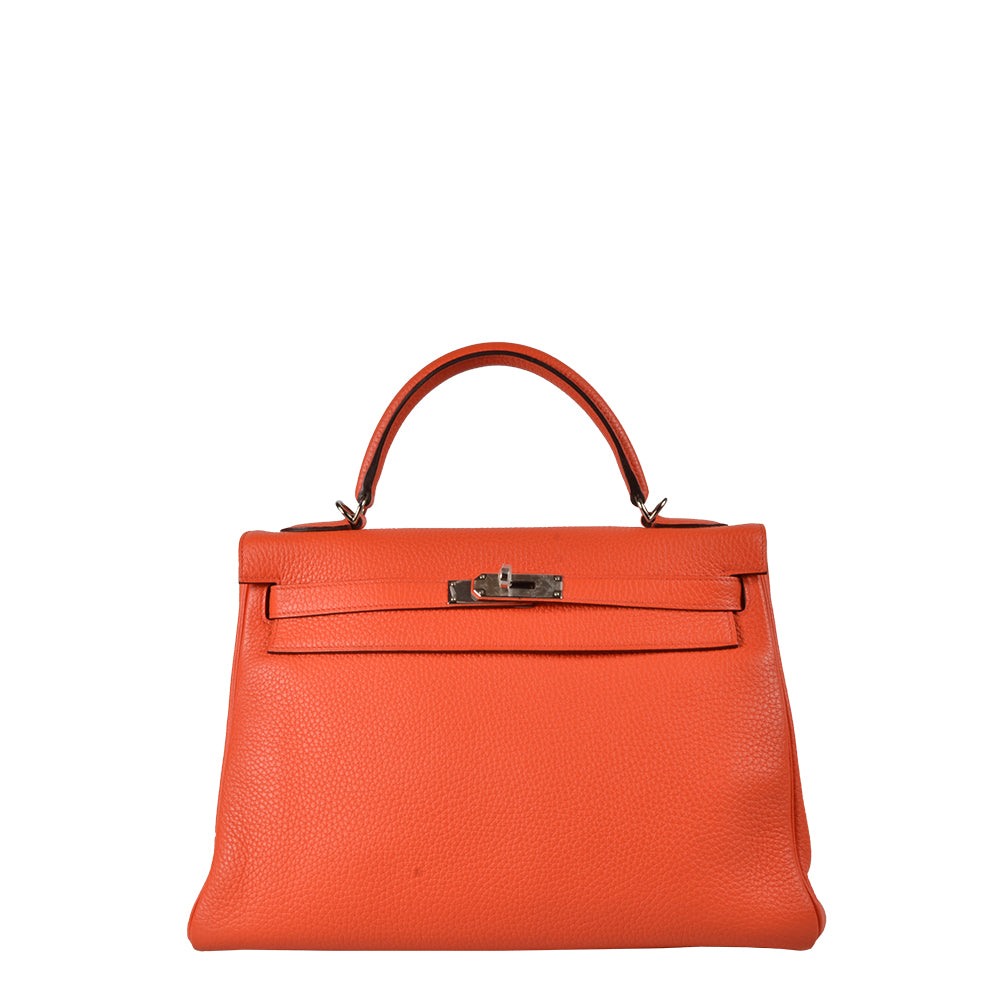 Diese wunderschöne Handtasche stammt aus dem Hause Hermès und nennt sich “Kelly”. Die Tasche findet Ihren Ursprungsgedanken in den dreißiger Jahren, lange vor der Birkin Bag. Der damalige Chef-Designer bei Hermes, Robert Dumas, gestaltete die originale Kelly, names “Sac Depeche”, durch Inspiration von Grace Kelly in den 50er Jahren um. Hier zum Verkauf steht die Kelly in der Größe 32, hergestellt aus hochwertigem Clemence Leder in Orange Poppy mit Palladium Hardware.