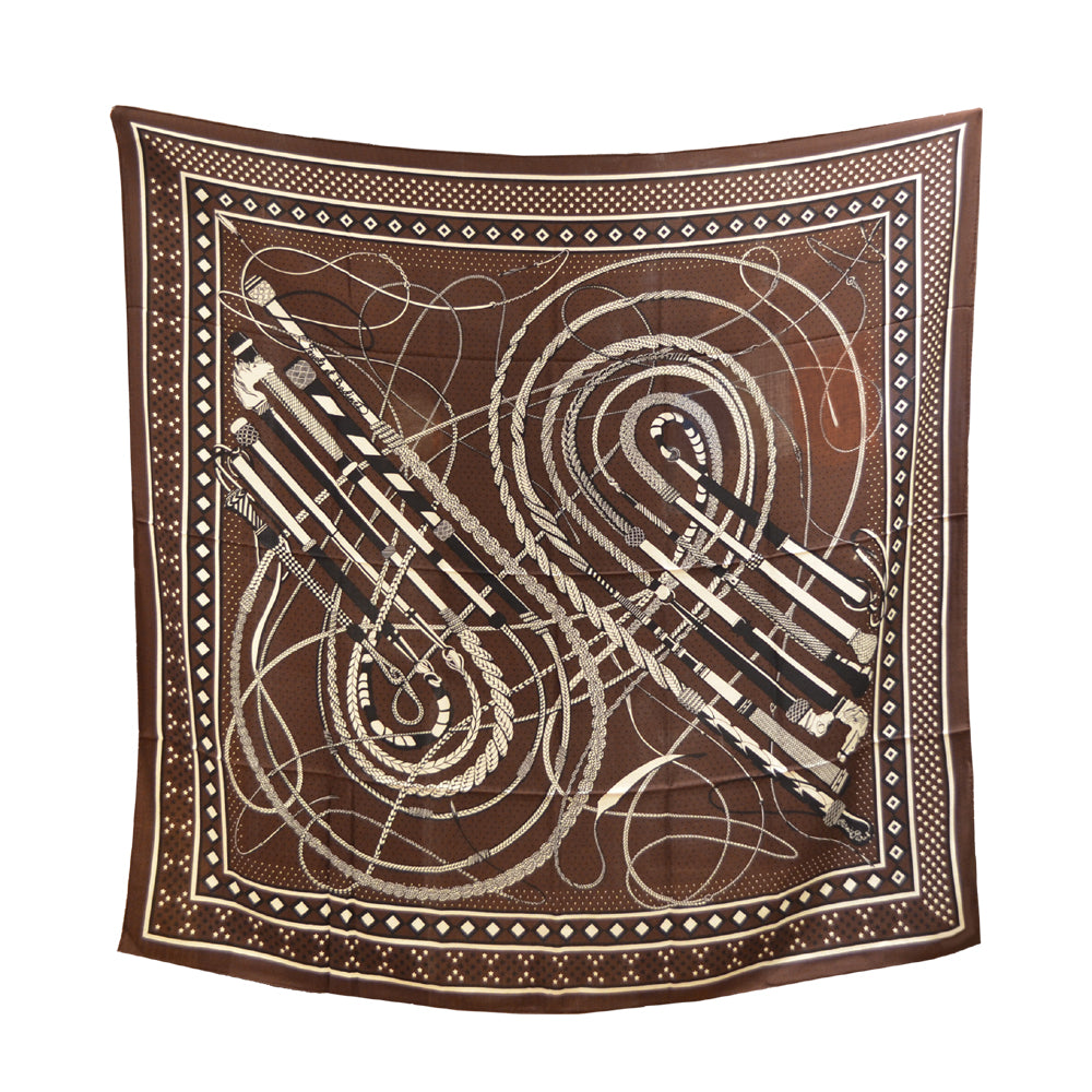 Gemalt von der Künstlerin Virginie Jamin sieht man in einander geschwungene Peitschen und Stöcke. Die Künstlerin bezieht sich bei ihren Bildern auf die alten Designs von Emile Hermes. Die Enden der Peitschen sind mit verschiedenen Tierköpfen versehen. Die Peitschen bilden spielerische Wirbel auf dem Tuch.