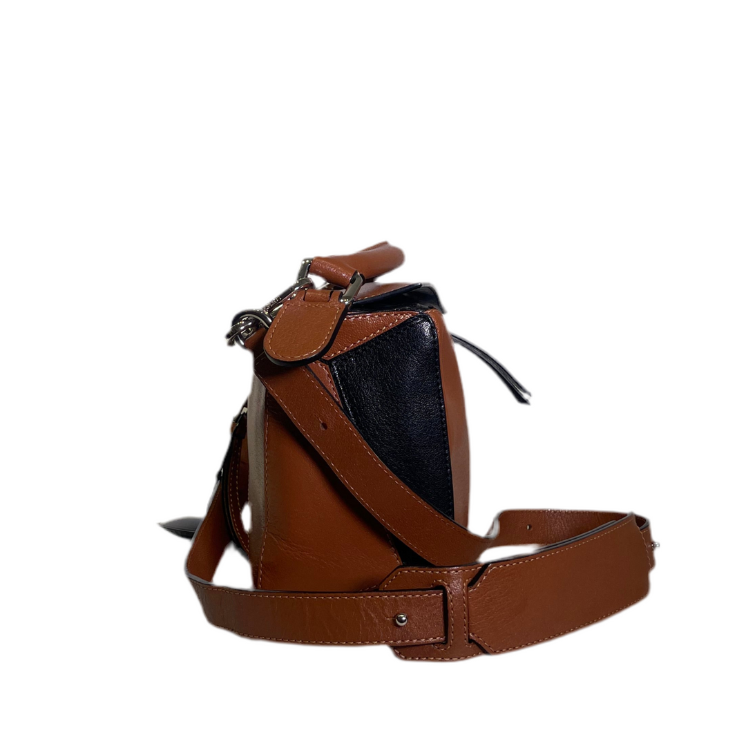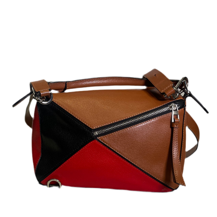 Die Loewe Tasche Puzzle Small ist ein luxuriöses und exklusives Accessoire aus feinstem Leder. In der Farbkombination aus Cognac, Rot und Schwarz und mit Silber-Hardware ist sie ein wahres Kunstwerk und verkörpert Eleganz und Geschmack. Ein Must-Have für alle, die das Besondere suchen.