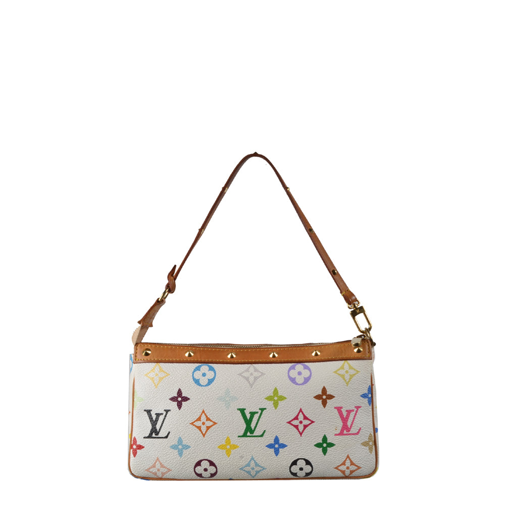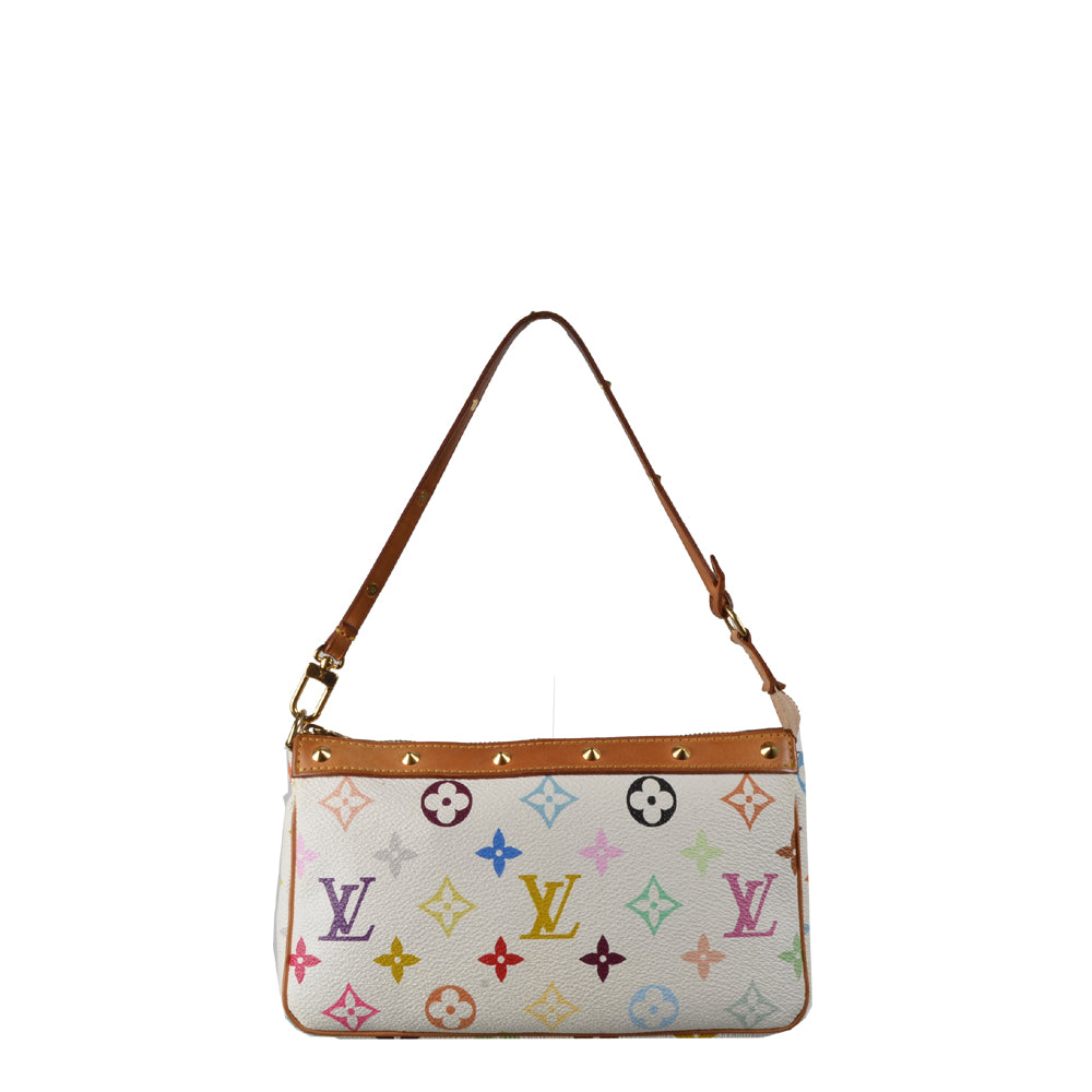 Diese schöne Pochette aus dem Hause Louis Vuitton mit Multicolor Monogram auf weißem Hintergrund ist ein schöner Begleiter für jeden Tag. Der Schulterriemen ist abnehmbar und lässt sich gegen jeden beliebigen Riemen austauschen. Diese Pochette stammt aus der Kollektion in Kollaboration mit dem Künstler Takashi Murakami.