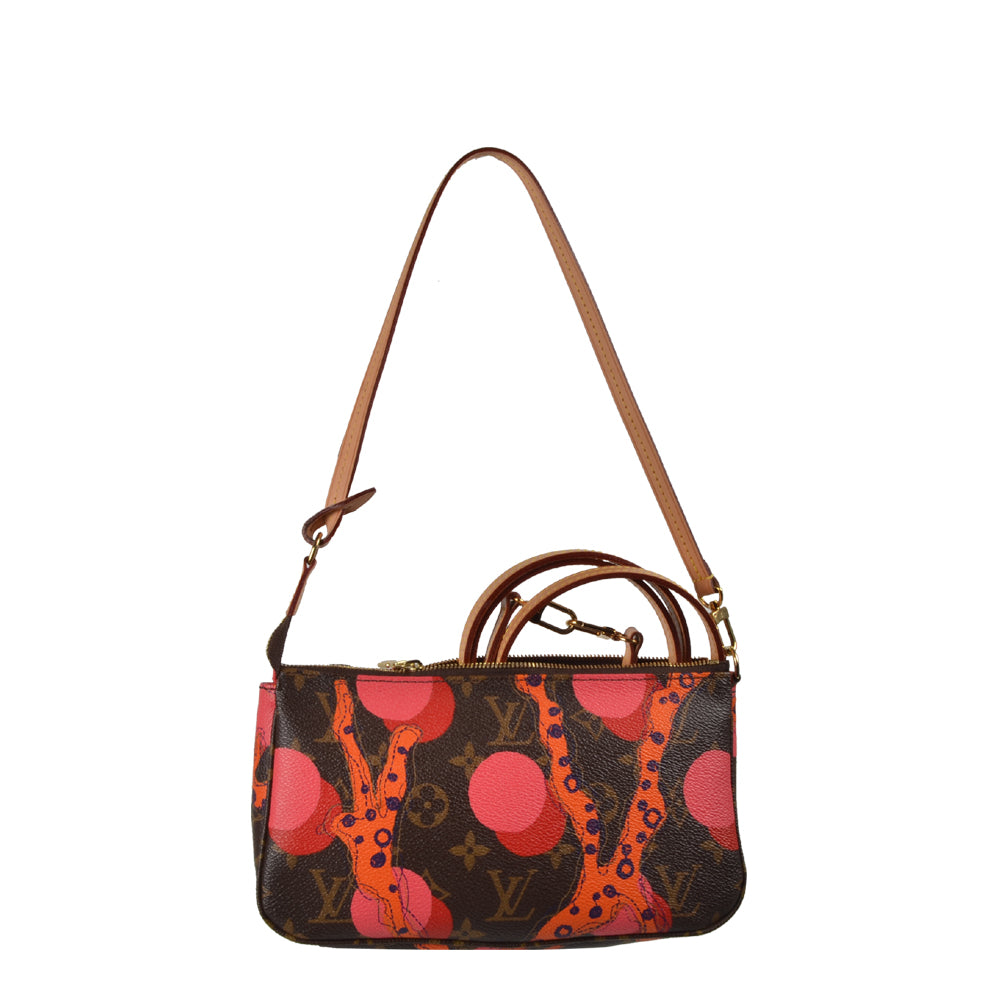 Diese Pochette aus dem Hause Louis Vuitton ist eine limited Editionen mit dem Namen “Ramages”. Auf dem Monogram Hintergrund sind rote und pinke Punkte zu sehen, so wie ein orange/blaues Muster. Der Schulterriemen ist abnehmbar und lässt sich gegen den dazu gehörigen längeren Riemen austauschen.