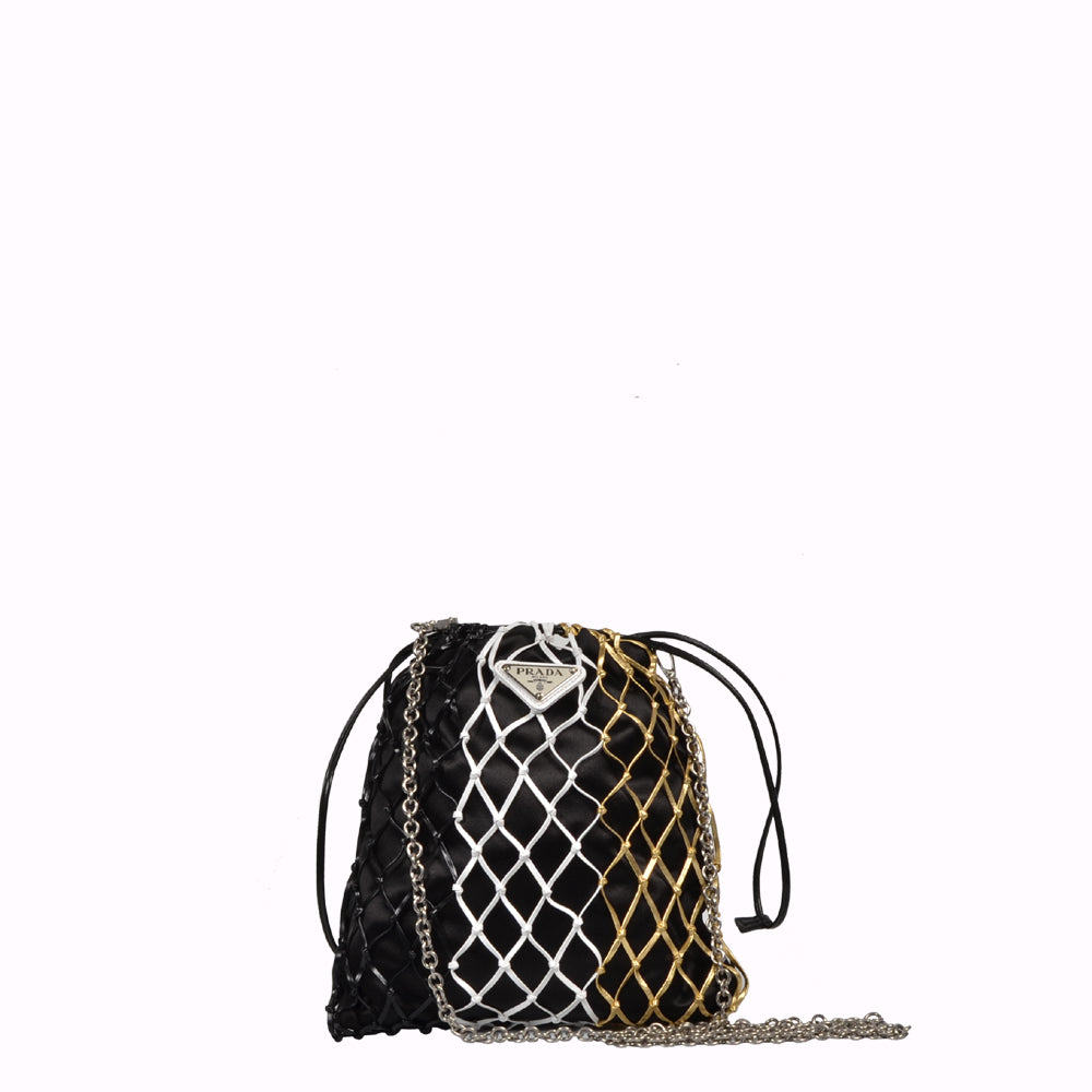 Prada Tasche Clutch aus Mesh und Satin schwarz gold weiß