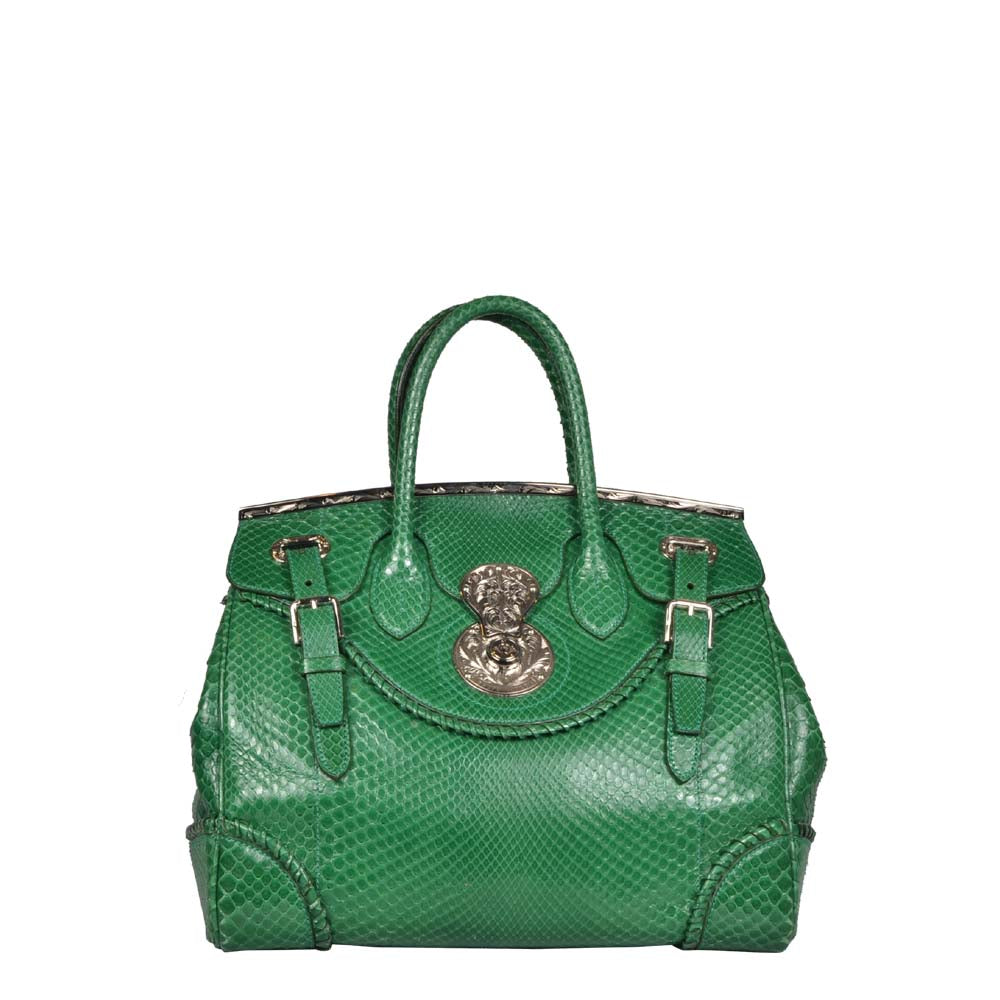Die Ralph Lauren Python Tasche verkörpert zeitlose Eleganz und luxuriöses Design. Gefertigt aus feinstem Pythonleder in edlem Smaragdgrün, zieht sie sofort alle Blicke auf sich. Die silberfarbene Hardware setzt stilvolle Akzente und unterstreicht den exklusiven Charakter dieser Designer-Tasche.